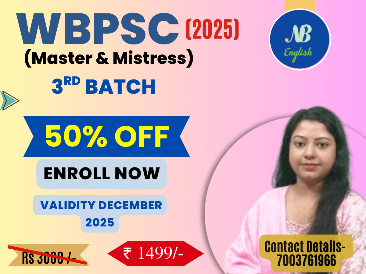 🛑WBPSC ENGLISH TEACHER RECRUITMENT 2025 3RD BATCH** 🟥 Total 9th months validity (April to December) 🟩Live Class 🛑 Weekly one doubt clearing Live Session on Tuesdays at 8 PM (via application) ✅ Recorded Classes from the given syllabus [line-by-line textual analysis, excluding dramas and novels] ✅Study Materials (PDF) ✅Grammar Materials and Classes ✅Topic Wise and Full Length Mock Test 📢📢💥 Make sure to download and print the PDF notes; otherwise, pdf notes will not be provided after the course ends.💥💥💥